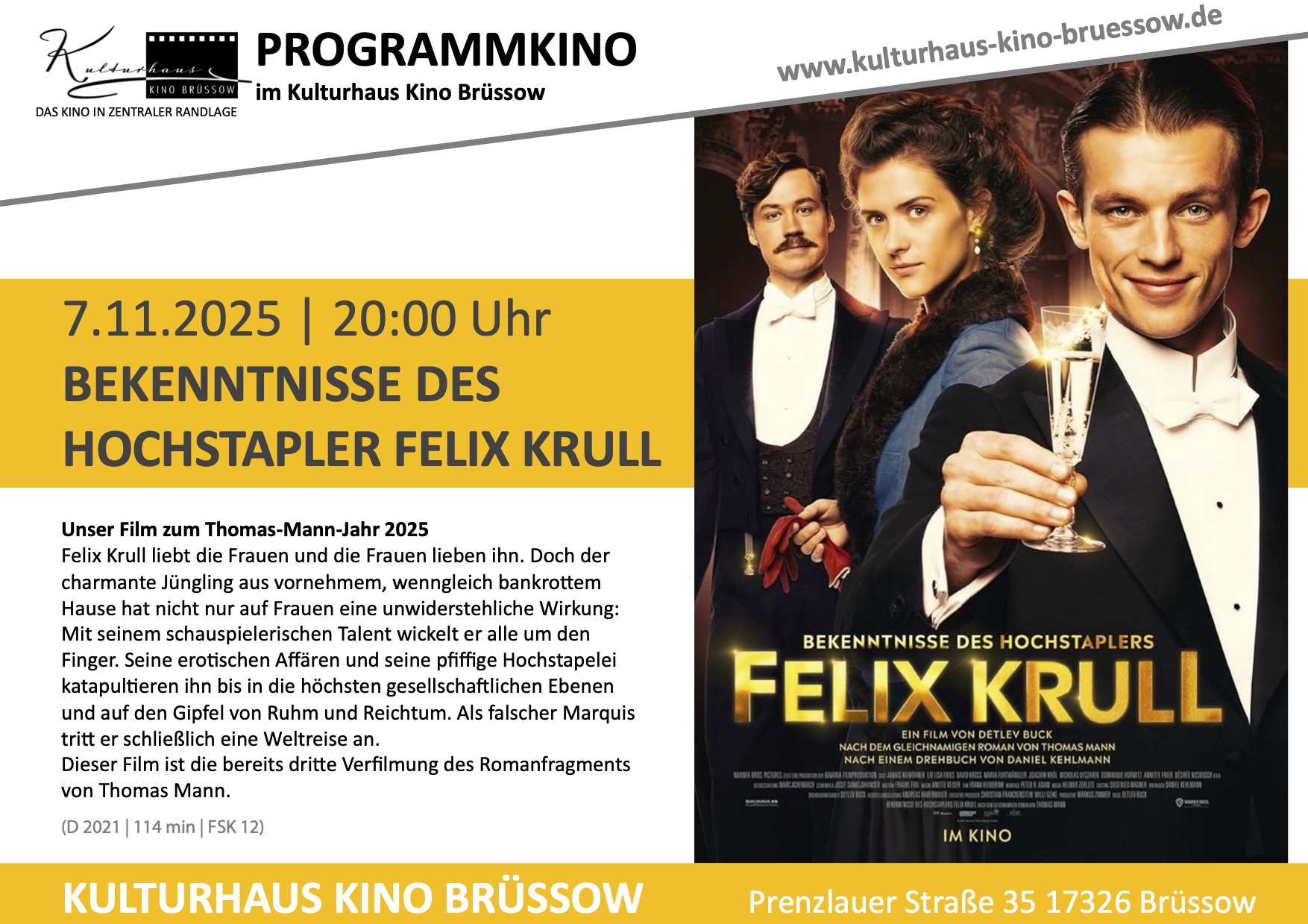 Felix Krull liebt die Frauen und die Frauen lieben ihn. Doch der charmante Jüngling aus vornehmem, wenngleich bankrottem Hause hat nicht nur auf Frauen eine unwiderstehliche Wirkung: Mit seinem schauspielerischen Talent wickelt er alle um den Finger. Seine erotischen Affären und seine pfiffige Hochstapelei katapultieren ihn bis in die höchsten gesellschaftlichen Ebenen und auf den Gipfel von Ruhm und Reichtum. Als falscher Marquis tritt er schließlich eine Weltreise an.
